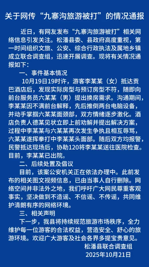 - 2025-10-22网友发布“九寨沟旅游被打”相关信息,官方通报:女子因房型不符与酒店前台发生冲突,已出院
