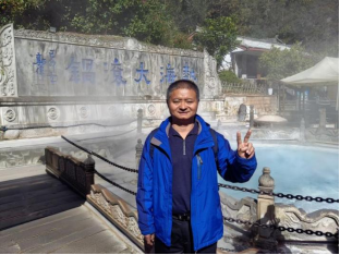 (龚剑新在热海大滚锅前留影) 摄影:贺定荣