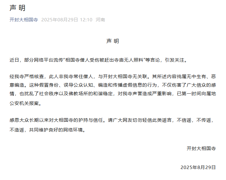 经我寺严格核查,此人非我寺常住僧人,与开封大相国寺无关联。其所述内容纯属无中生有、恶意编造。这种假冒身份、误导公众认知、编造和传播虚假信息的行为,不仅伤害了广大信众的感情,也扰乱了社会秩序以及佛教场所的和谐稳定,对我寺声誉造成严重影响,已第一时间向属地公安机关报案。