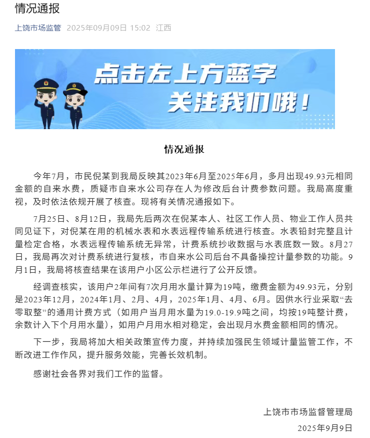 - 2025-09-09官方通报“多个月水费都是49.93元”:供水行业采取“去零取整”计费方式,自来水公司后台不具备操控计量参数功能