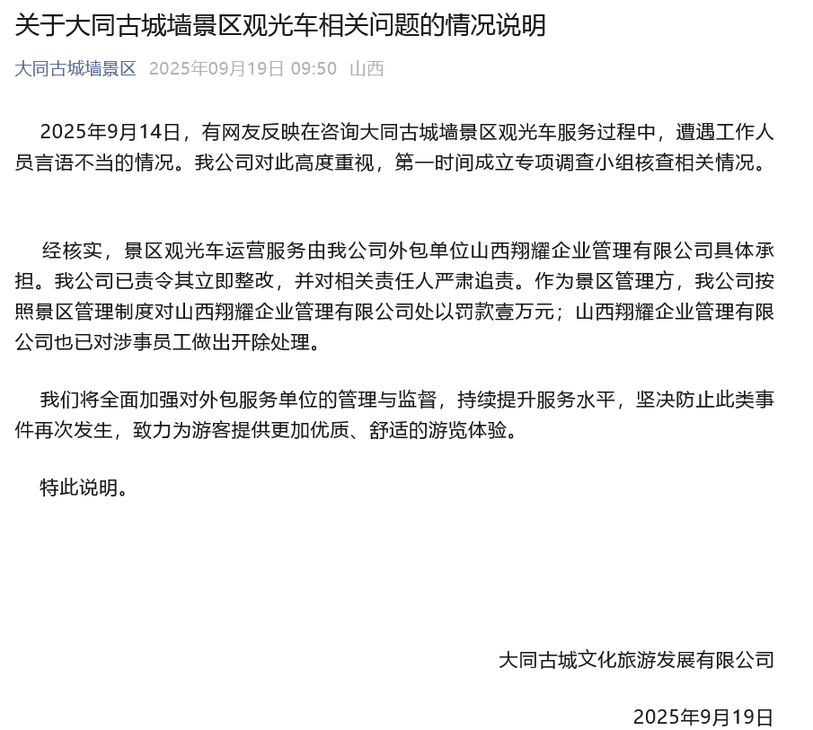 - 2025-09-19大同古城墙景区通报“网友反映在乘观光车遭遇工作人员言语不当”:对外包公司罚款1万,已开除涉事员工