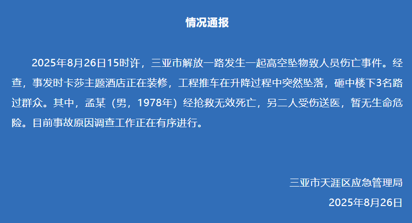 8月26日15时许,三亚市解放一路发生一起高空坠物致人员伤亡事件。经查,事发时卡莎主题酒店正在装修,工程推车在升降过程中突然坠落,砸中楼下3名路过群众。其中,孟某(男,1978年)经抢救无效死亡,另二人受伤送医,暂无生命危险。