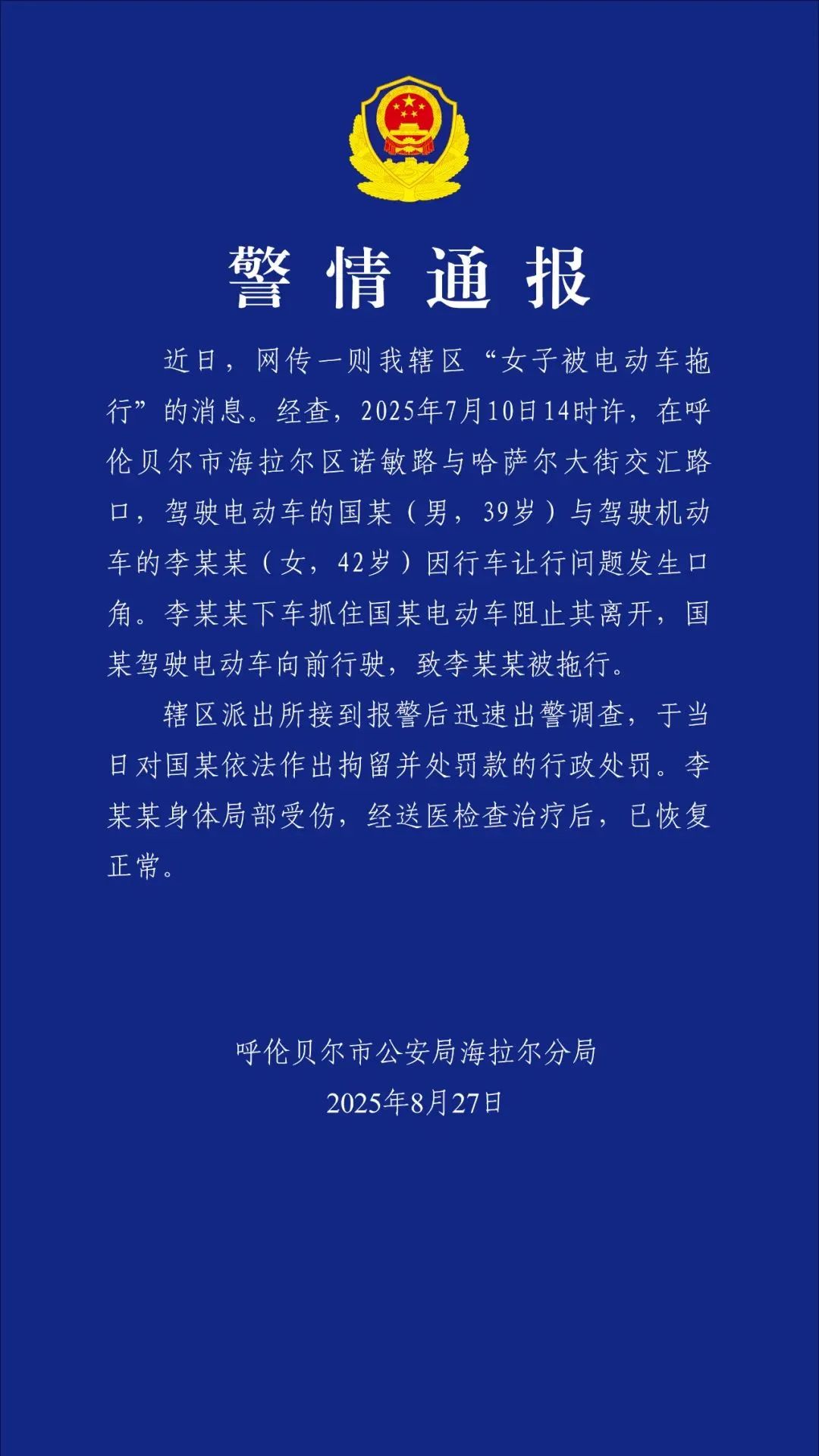 近日,网传一则我辖区“女子被电动车拖行”的消息。经查,2025年7月10日14时许,在呼伦贝尔市海拉尔区诺敏路与哈萨尔大街交汇路口,驾驶电动车的国某(男,39岁)与驾驶机动车的李某某(女,42岁)因行车让行问题发生口角。李某某下车抓住国某电动车阻止其离开,国某驾驶电动车向前行驶,致李某某被拖行。