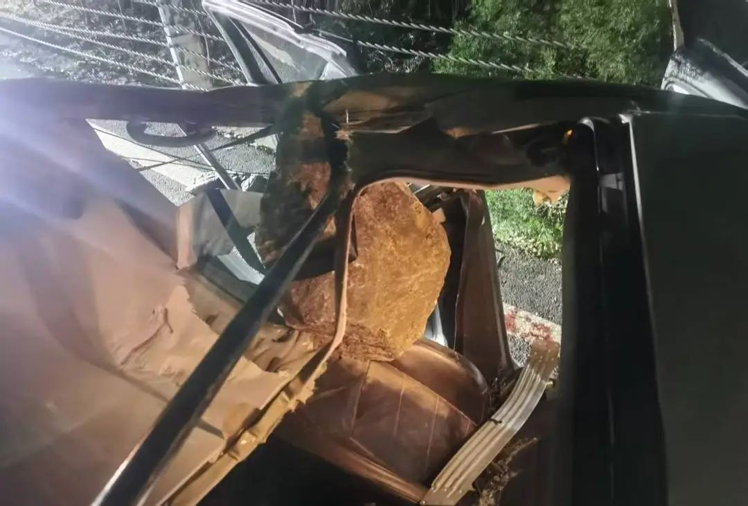 刘女士称,事发路段的西侧是山体,当时丈夫在驾驶位开车,她和两个孩子坐在后排,“大概是8点多的时候,突然听见一声巨响,我当时还不知道怎么回事,就感觉车顶往下陷了一下。”车辆在撞到道路左侧的护栏后停下,下车后她才发现一块大石头砸破了天窗,落到了主驾驶位上。她看到丈夫头部受伤,一直在流血,后来消防到场后,才将其抬出送医,“送到医院后拉了心电图,人家就直接宣布死亡了。”