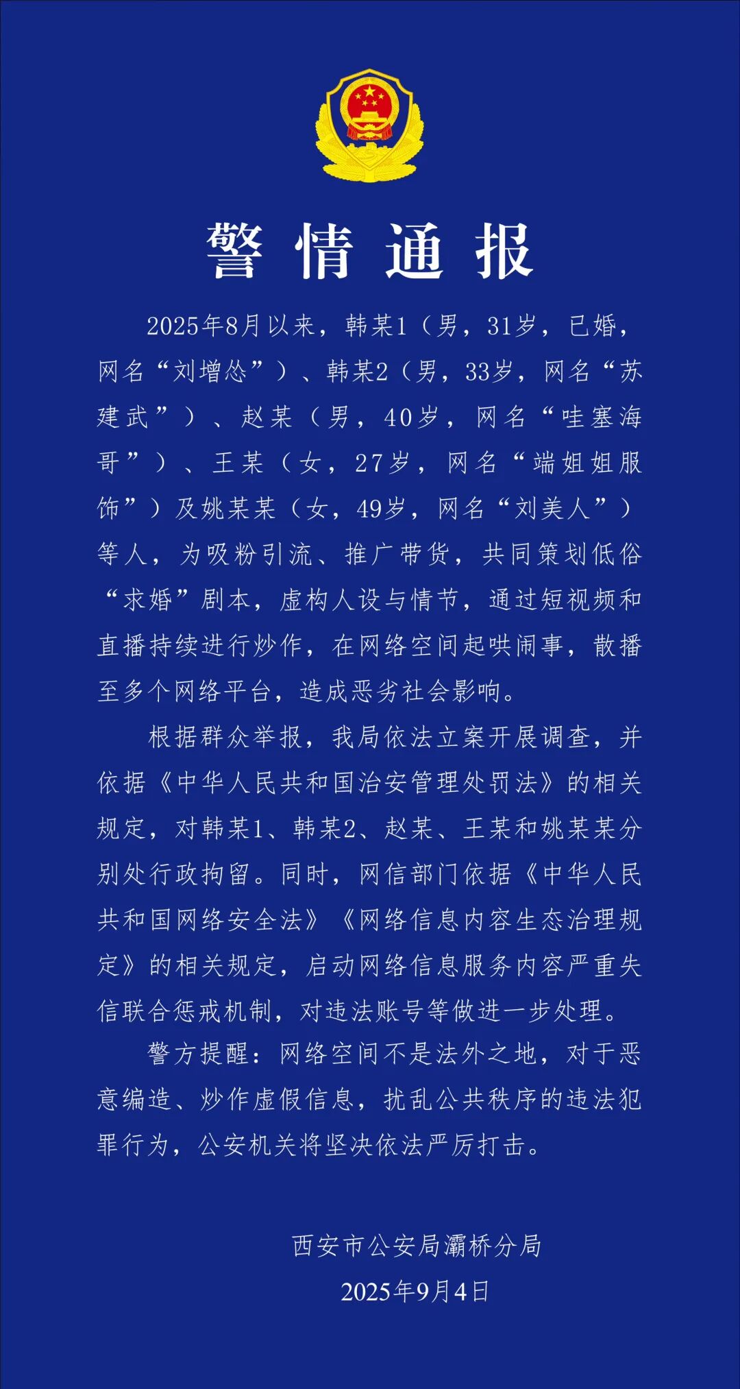 9月4日,陕西西安市公安局灞桥分局通报5人为推广带货策划炒作低俗求婚视频被行拘。