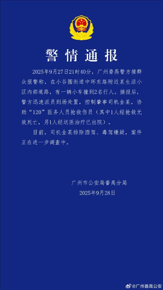 9月28日晚,广州市公安局番禺分局通报一起交通事故:27日晚某生活小区一辆小车撞到2名行人,警方迅速控制肇事司机金某,伤员中1人经抢救无效死亡,另1人经送医治疗已出院。目前,司机金某排除酒驾、毒驾嫌疑。
