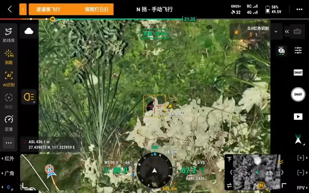多次搜寻之后,谭章突然发现屏幕上出现一个亮点。“我在飞行搜索的时候,很多村民就围在旁边看,说那可能是一只鸟,以前也遇到过这样的情况,我还是觉得这个亮点要分析一下。于是就下降高度,用热成像镜头放大看,感觉到那个亮点在移动。”生命的希望就此出现,继续下降高度之后,谭章打开探照灯,用无人机可见光的变焦模式仔细看。“茂密的树叶旁边,有一个黑色头发的头顶,我就知道这肯定是一个人,但是不能确定是谁。”
